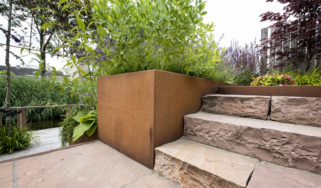 Borders en plantenbakken van cortenstaal zijn dé kenmerkende materialen van de industriële tuin. Na verloop van tijd krijgt het materiaal een warme, roestbruine patina die zorgt voor een karakteristieke uitstraling én extra bescherming. Als alternatief kunt u kiezen voor plantenbakken van gegoten beton of natuursteen in strakke, geometrische vormen.